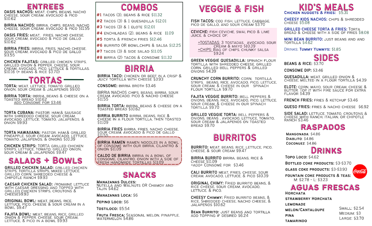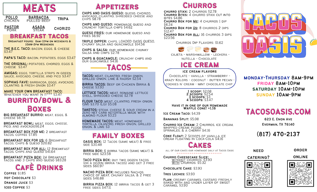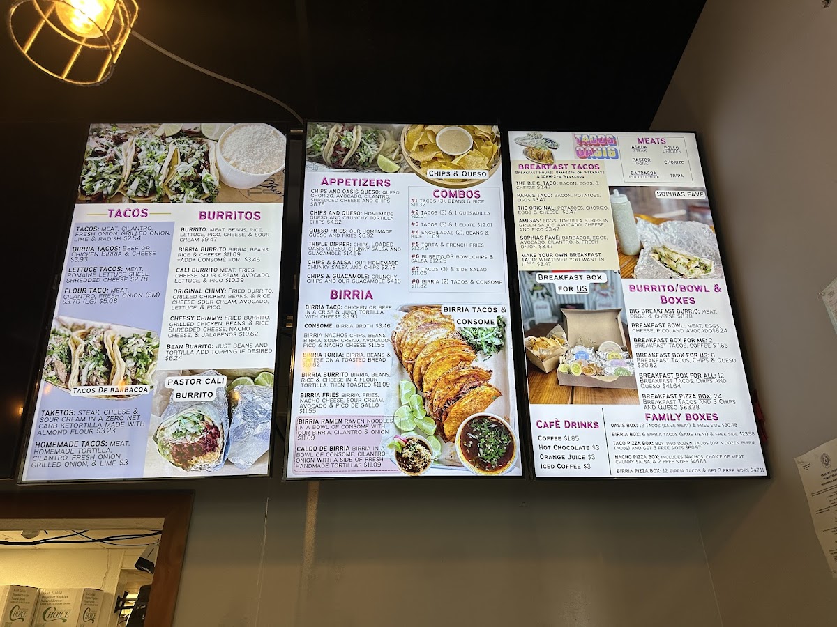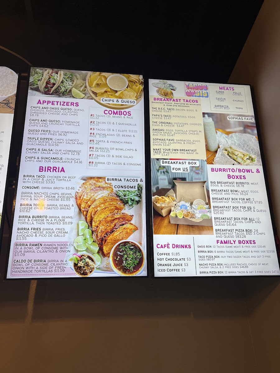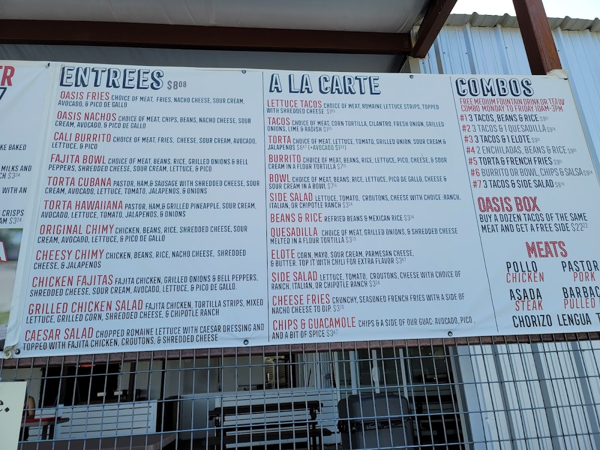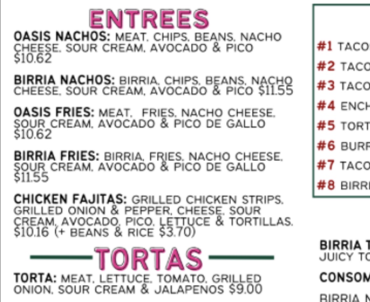 Tacos Oasis in Everman, TX, offers a unique blend of bold flavors and inviting atmosphere. Their menu stands out with hearty birria dishes like the Birria Fries featuring tender birria atop crispy fries, topped with nacho cheese, avocado, and pico de gallo—an irresistible comfort food twist. The Oasis Nachos and Oasis Fries allow customization with your choice of meat, ensuring each bite bursts with savory satisfaction. For a classic touch, their Chicken Fajitas deliver perfectly grilled chicken, peppers, and fresh accompaniments wrapped in warm tortillas.