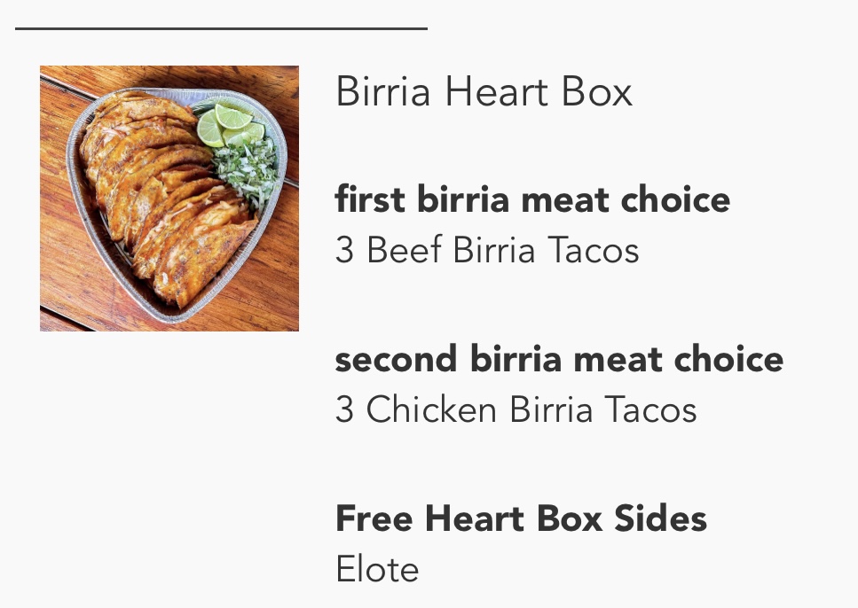 Beyond tacos and mains, the Heart Box menu captures the spirit of sharing, with treats like churro bites and themed heart-shaped tacos, ideal for special occasions. Their birria offerings, from the rich Caldo De Birria to the crispy Birria Tacos and sliders, highlight slow-cooked, deeply flavorful meat paired with handmade tortillas and fresh garnishes.